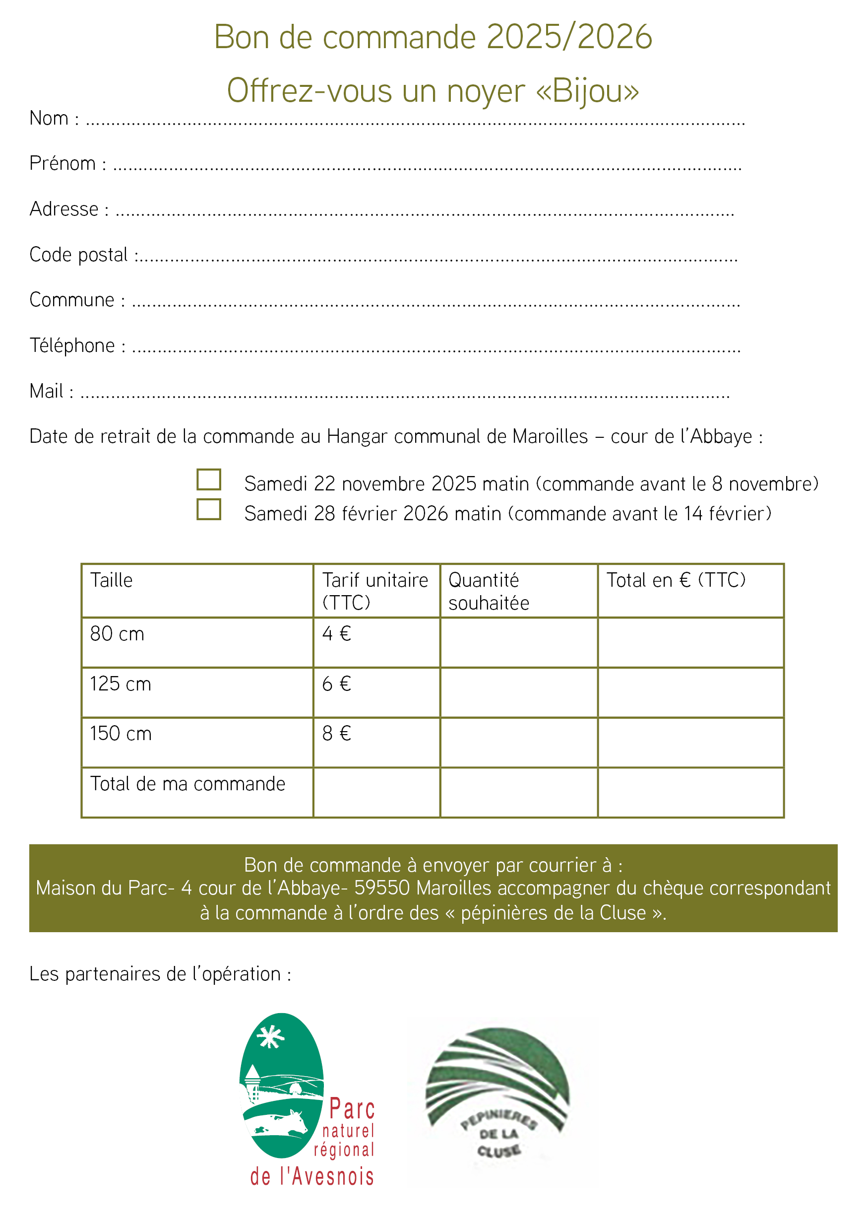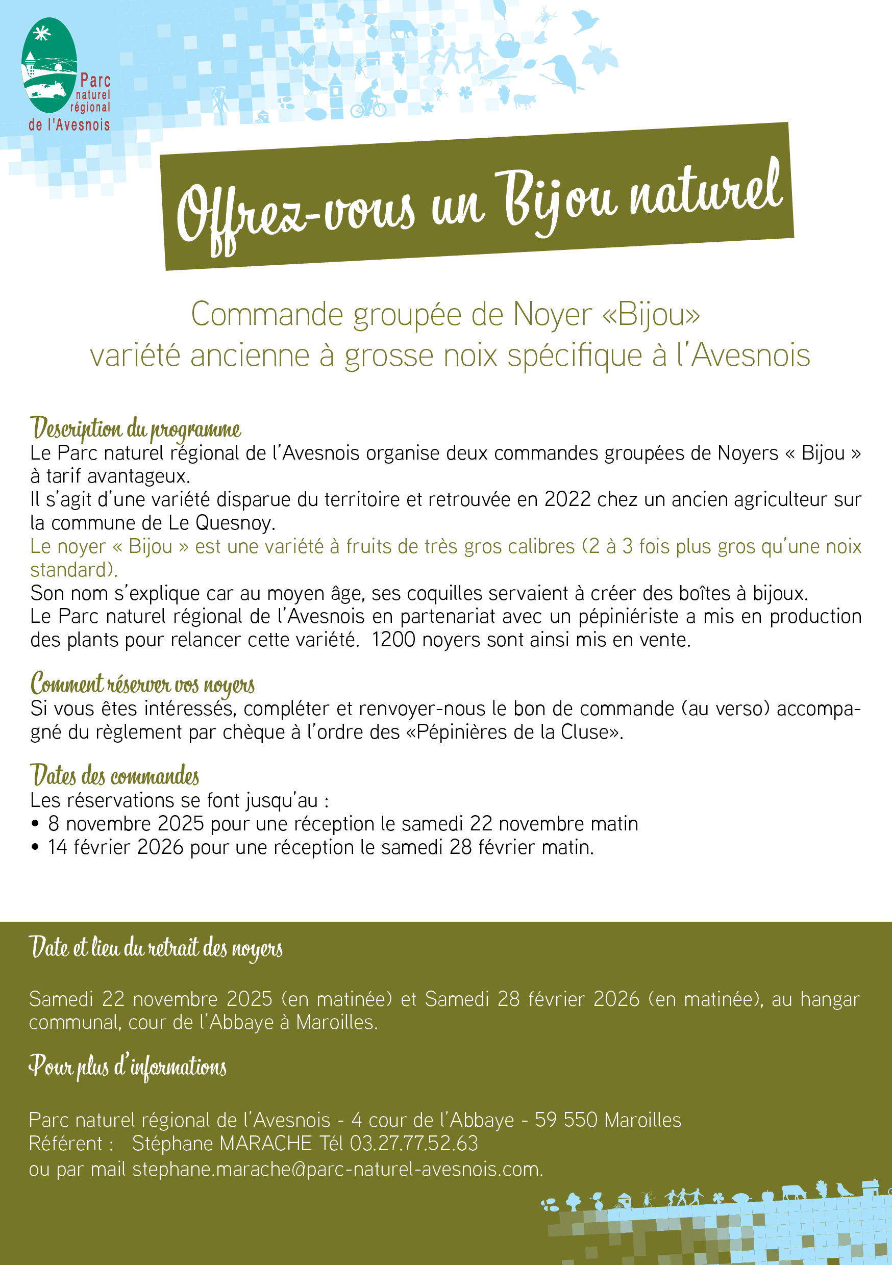 Le Parc naturel régional de l’Avesnois, propose une commande groupée de noyers « Bijou », variété ancienne à grosse noix spécifique de l’Avesnois. Cette opération vient compléter la campagne de « Plantons le décor » qui permet déjà de commander des arbres et arbustes d’essences locales.